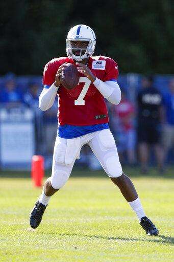 Indianapolis Colts quarterback Jacoby Brissett (7) throws during practice at the NFL team's football training camp in Westfield, Ind., Wednesday, July 31, 2019. (AP Photo/Michael Conroy) The Associated Press
