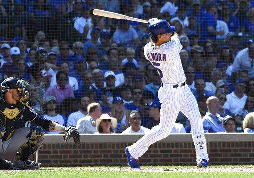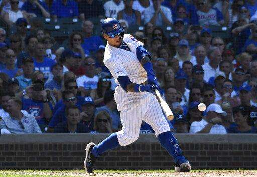 Chicago Cubs' Javier Baez (9) hits a one run single against the Milwaukee Brewers during the eighth inning of a baseball game, Saturday, Aug. 3, 2019, in Chicago. (AP Photo/David Banks) The Associated Press