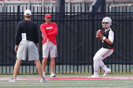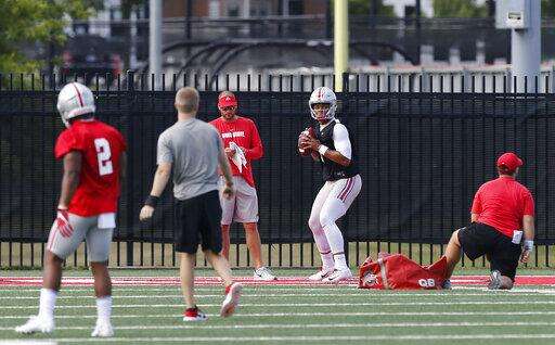 Ohio State quarterback Justin Fields drops back to pass during NCAA college football practice, Friday, Aug. 2, 2019, in Columbus, Ohio. (AP Photo/Jay LaPrete) The Associated Press