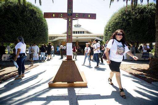 Mourners leave a funeral for Keyla Salazar, 13, on Tuesday, Aug. 6, 2019, in San Jose, Calif. Salazar and two others were killed when a gunman opened fire at the Gilroy Garlic Festival July 28. (AP Photo/Noah Berger) The Associated Press