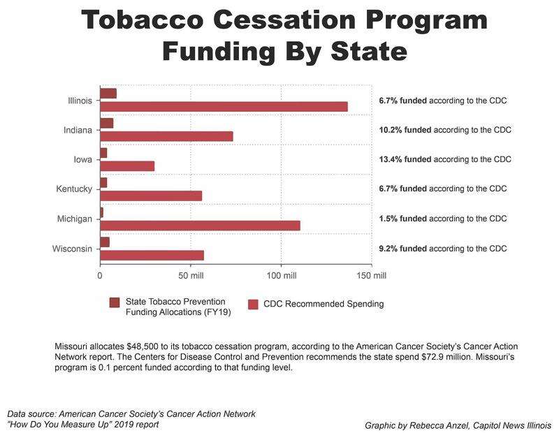 The Centers for Disease Control and Prevention recommends that Illinois spend $136.7 million on a tobacco prevention and cessation program. According to the report, Illinois allocates $9.1 million to the initiative, 6.7 percent of the recommended level.