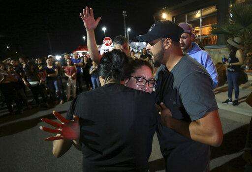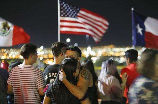 Members of Iglesia Cristiana Manatial en el Desierto pray with El Pasoans who came to hold vigil Monday, Aug. 5, 2019, outside the Walmart in El Paso, Texas, where a mass shooting took place on Saturday. (Mark Lambie/The El Paso Times via AP)