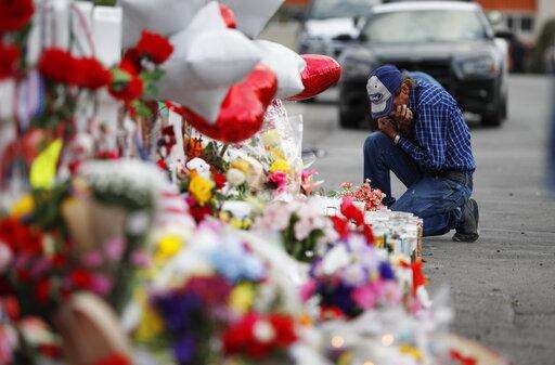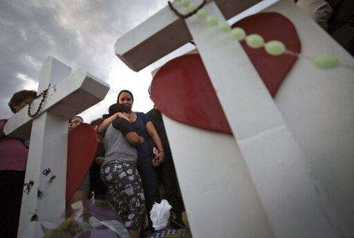 Gloria Garces kneels in front of crosses at a makeshift memorial near the scene of a mass shooting at a shopping complex Tuesday, Aug. 6, 2019, in El Paso, Texas. The border city jolted by a weekend massacre at a Walmart absorbed more grief Monday as the death toll climbed and prepared for a visit from President Donald Trump over anger from El Paso residents and local Democratic leaders who say he isn't welcome and should stay away. (AP Photo/John Locher)