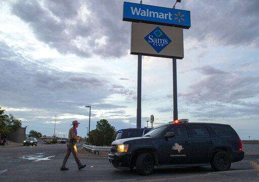 FILE - In this Aug. 4, 2019, file photo a Texas State Trooper walks back to his car while providing security outside the Walmart store in the aftermath of a mass shooting in El Paso, Texas. Like most retailers, Walmart is accustomed to the everyday dealings of shoplifters. Now, itâs confronting a bigger threat: active shooters. Days after a man opened fire at one of its stores in El Paso and left several dead, the nationâs largest retailer is faced with how to make its workers and customers feel safe. (AP Photo/Andres Leighton, File)