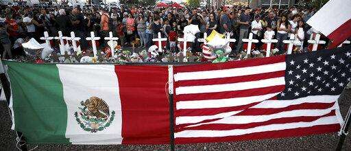 Flags fly over crosses at a makeshift memorial near the scene of a mass shooting at a shopping complex Tuesday, Aug. 6, 2019, in El Paso, Texas. The border city jolted by a weekend massacre at a Walmart absorbed more grief Monday as the death toll climbed and prepared for a visit from President Donald Trump over anger from El Paso residents and local Democratic leaders who say he isn't welcome and should stay away. (AP Photo/John Locher)