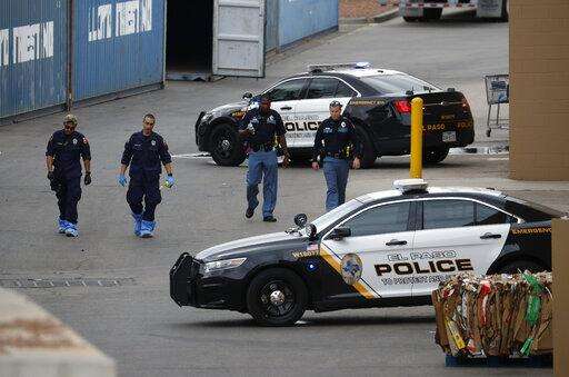 Police officers walk behind a Walmart at the scene of a mass shooting at a shopping complex Tuesday, Aug. 6, 2019, in El Paso, Texas. Patrick Crusius, 21, opened fire Saturday at the mall that largely caters to the local Mexican-American community. (AP Photo/John Locher)