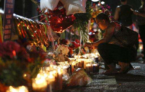Roxana Jaquez lights a candle at an ever growing memorial Monday, Aug. 5, 2019, outside the Walmart in El Paso, Texas, wherea mass shooting took place on Saturday. (Mark Lambie/The El Paso Times via AP)