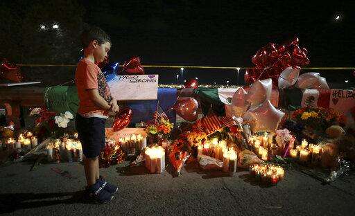 A boy reacts as he looks at teddy bears left for children killed, during a vigil Monday, Aug. 5, 2019, outside the Walmart in El Paso, Texas, where a mass shooting took place on Saturday. (Mark Lambie/The El Paso Times via AP)