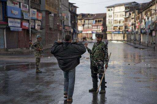 An Indian Paramilitary soldier orders a Kashmiri to lift his robe before frisking him during curfew in Srinagar, Indian controlled Kashmir, Thursday, Aug. 8, 2019. The lives of millions in India's only Muslim-majority region have been upended since the latest, and most serious, crackdown followed a decision by New Delhi to revoke the special status of Jammu and Kashmir and downgrade the Himalayan region from statehood to a territory. Kashmir is claimed in full by both India and Pakistan, and rebels have been fighting Indian rule in the portion it administers for decades. (AP Photo/Dar Yasin) The Associated Press