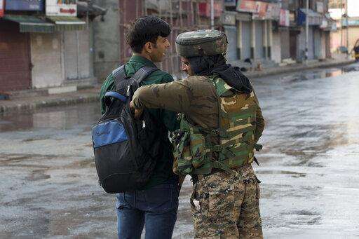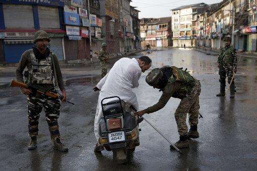 Indian Paramilitary soldiers check the bag of a man riding a scooter during curfew in Srinagar, Indian controlled Kashmir, Thursday, Aug. 8, 2019. The lives of millions in India's only Muslim-majority region have been upended since the latest, and most serious, crackdown followed a decision by New Delhi to revoke the special status of Jammu and Kashmir and downgrade the Himalayan region from statehood to a territory. Kashmir is claimed in full by both India and Pakistan, and rebels have been fighting Indian rule in the portion it administers for decades. (AP Photo/Dar Yasin) The Associated Press