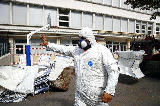 Mickael Prestavoine, director of industrial operations gestures as workers remove the lead particles in the school yard of Saint Benoit primary school in Paris, France, Thursday, Aug. 8, 2019. Workers have started decontaminating some Paris schools tested with unsafe levels of lead following the blaze at the Notre Dame Cathedral, as part of efforts to protect children from risks of lead poisoning. (AP Photo/Francois Mori)