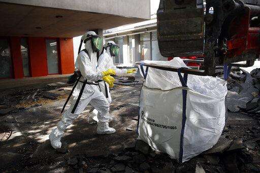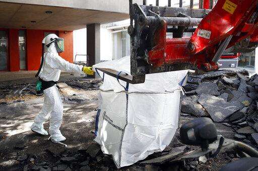 Worker carry grabbing pieces of destroyed surfacing to gather up the lead particles in the school yard of Saint Benoit primary school in Paris, France, Thursday, Aug. 8, 2019. Workers have started decontaminating some Paris schools tested with unsafe levels of lead following the blaze at the Notre Dame Cathedral, as part of efforts to protect children from risks of lead poisoning. (AP Photo/Francois Mori)