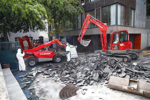 Workers direct a mechanical shovel grabbing pieces of destroyed surfacing to gather up the lead particles in the school yard of Saint Benoit primary school in Paris, France, Thursday, Aug. 8, 2019. Workers have started decontaminating some Paris schools tested with unsafe levels of lead following the blaze at the Notre Dame Cathedral, as part of efforts to protect children from risks of lead poisoning. (AP Photo/Francois Mori)