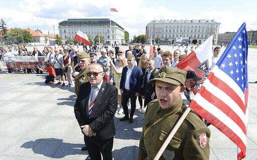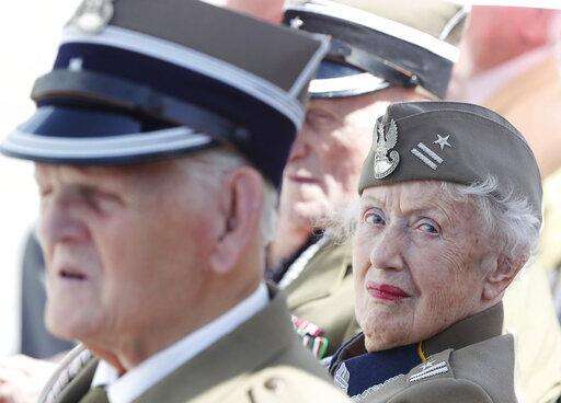 Polish officials and war veterans pay tribute to a World War II-era underground force that collaborated with Nazi German forces toward the end of the war in their battle against the Communists, who were imposing control on the nation, in Warsaw, Poland, Sunday, Aug. 11, 2019. President Andrzej Duda's official patronage and the presence of ruling party officials underlined the right-wing government's rehabilitation of a partisan unit that fought both Germans and Soviets and which is celebrated by the far right .(AP Photo/Czarek Sokolowski)