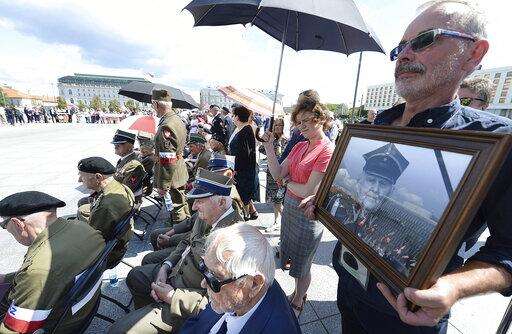 Polish officials and war veterans pay tribute to a World War II-era underground force that collaborated with Nazi German forces toward the end of the war in their battle against the Communists, who were imposing control on the nation, in Warsaw, Poland, Sunday, Aug. 11, 2019. President Andrzej Duda's official patronage and the presence of ruling party officials underlined the right-wing government's rehabilitation of a partisan unit that fought both Germans and Soviets and which is celebrated by the far right. (AP Photo/Czarek Sokolowski)