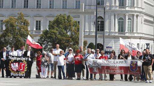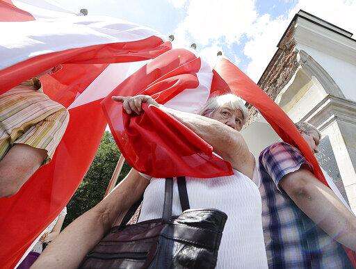People hold Polish national flags as they attend an event by Polish officials and war veterans to pay tribute to a World War II-era underground force that collaborated with Nazi German forces toward the end of the war in their battle against the Communists, in Warsaw, Poland, Sunday, Aug. 11, 2019. President Andrzej Duda's official patronage and the presence of ruling party officials underlined the right-wing government's rehabilitation of a partisan unit that fought both Germans and Soviets and which is celebrated by the far right. (AP Photo/Czarek Sokolowski)