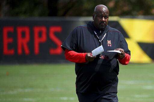 FILE - In this Aug. 2, 2019, file photo, Maryland head coach Mike Locksley looks on as his team works out during a NCAA college football training camp in College Park, Md. Coming off the darkest season in the history of the Maryland football program, the Terrapins are poised to enter a new era under Mike Locksley, hired in December after a successful run as Alabama's offensive coordinator, who remembers what it was like when the team competed for conference titles and counted on playing in bowl games. (AP Photo/Will Newton, File) The Associated Press