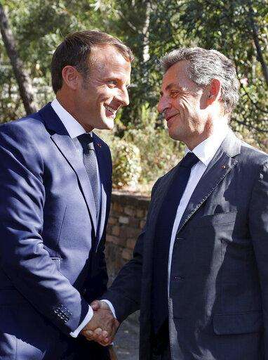 French President Emmanuel Macron, left, meets former French President Nicolas Sarkozy during a ceremony marking the 75th anniversary of the WWII Allied landings in Provence, in Saint-Raphael, southern France, Thursday, Aug. 15, 2019. Starting on Aug. 15, 1944, French and American troops - 350,000 in total - landed on the French Riviera. U.S. forces drove north while French troops - many from French colonies in Africa - moved along the coast to secure key ports. (Eric Gaillard/POOL via AP)
