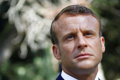 French President Emmanuel Macron attends a ceremony marking the 75th anniversary of the WWII Allied landings in Provence, in Saint-Raphael, southern France, Thursday, Aug. 15, 2019. Starting on Aug. 15, 1944, French and American troops - 350,000 in total - landed on the French Riviera. U.S. forces drove north while French troops - many from French colonies in Africa - moved along the coast to secure key ports. (Eric Gaillard/POOL via AP)