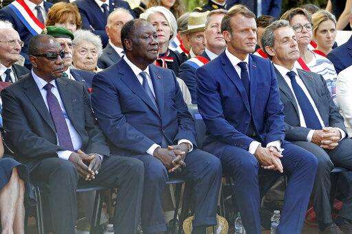 French President Emmanuel Macron, second right, former French President Nicolas Sarkozy, right, Ivory Coast's President Alassane Ouattara, second left, and Guinean President Alpha Conde attend a ceremony marking the 75th anniversary of the WWII Allied landings in Provence, in Saint-Raphael, southern France, Thursday, Aug. 15, 2019. Starting on Aug. 15, 1944, French and American troops - 350,000 in total - landed on the French Riviera. U.S. forces drove north while French troops - many from French colonies in Africa - moved along the coast to secure key ports. (Eric Gaillard/POOL via AP)