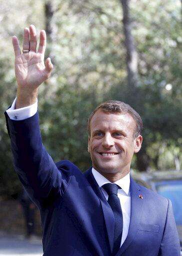 French President Emmanuel Macron waves as he arrives for a ceremony marking the 75th anniversary of the WWII Allied landings in Provence, in Saint-Raphael, southern France, Thursday, Aug. 15, 2019. Starting on Aug. 15, 1944, French and American troops - 350,000 in total - landed on the French Riviera. U.S. forces drove north while French troops - many from French colonies in Africa - moved along the coast to secure key ports. (Eric Gaillard/POOL via AP)