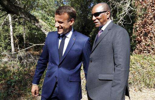 French President Emmanuel Macron, left, welcomes Guinean President Alpha Conde for a ceremony marking the 75th anniversary of the WWII Allied landings in Provence, in Saint-Raphael, southern France, Thursday, Aug. 15, 2019. Starting on Aug. 15, 1944, French and American troops - 350,000 in total - landed on the French Riviera. U.S. forces drove north while French troops - many from French colonies in Africa - moved along the coast to secure key ports. (Eric Gaillard/POOL via AP)