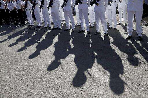 Soldiers wait for French President Emmanuel Macron during a ceremony marking the 75th anniversary of the WWII Allied landings in Provence, in Saint-Raphael, southern France, Thursday, Aug. 15, 2019. Starting on Aug. 15, 1944, French and American troops - 350,000 in total - landed on the French Riviera. U.S. forces drove north while French troops - many from French colonies in Africa - moved along the coast to secure key ports. (Eric Gaillard/POOL via AP)