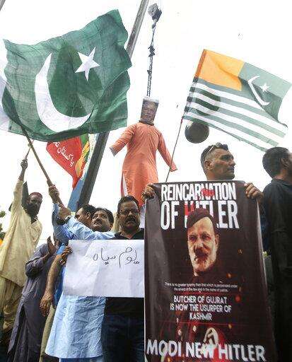Pakistani protesters hang an effigy of Indian Premier Narendra Modi during a rally against India on their Independence Day, in Karachi, Pakistan, Thursday, Aug. 15, 2019. Pakistanis have rallied urging the world community to take notice of human rights abuses in the disputed Muslim-majority Himalayan region of Indian Kashmir. Sign left reads, "Black day." (AP Photo/Fareed Khan)