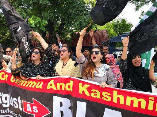 Pakistani Kashmiris observe Black Day on the occasion of India's Independence Day near Indian High Commission in Islamabad, Pakistan, Thursday, Aug. 15, 2019. Pakistan's prime minister has questioned the silence of world community over recent change in the status of Indian-administered sector of Kashmir by New Delhi and lingering imposition of security clampdown which deprived Kashmiri people of their basic rights. (AP Photo/B.K. Bangash)