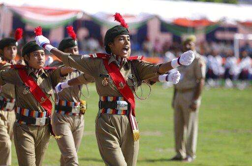 Members of the National Cadet Corps (NCC) march during India's Independence Day celebrations, in Jammu, India, Thursday, Aug.15, 2019. Indian Prime Minister Narendra Modi defended his government's controversial measure to strip the disputed Kashmir region of its statehood and special constitutional provisions in an Independence Day speech Thursday, as about 4 million Kashmiris stayed indoors for the 11th day of an unprecedented security lockdown and communications blackout. (AP Photo/Channi Anand)