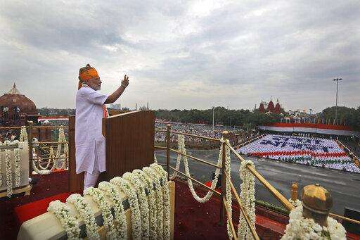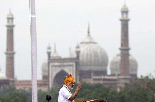 Indian Prime Minister Narendra Modi addresses to the nation on the country's Independence Day from the ramparts of the historical Red Fort in New Delhi, India, Thursday, Aug. 15, 2019. Modi said that stripping the disputed Kashmir region of its statehood and special constitutional provisions has helped unify the country. Modi gave the annual Independence Day address from the historic Red Fort in New Delhi as an unprecedented security lockdown kept people in Indian-administered Kashmir indoors for an eleventh day. (AP Photo/Manish Swarup)