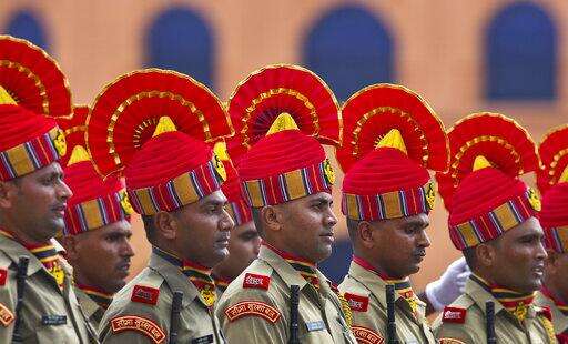 Indian Sashastra Seema Bal personnel take part in the Independence Day celebration parade in Gauhati, India, Thursday, Aug. 15, 2019. Indian Prime Minister Narendra Modi defended his government's controversial measure to strip the disputed Kashmir region of its statehood and special constitutional provisions in an Independence Day speech Thursday, as about 4 million Kashmiris stayed indoors for the 11th day of an unprecedented security lockdown and communications blackout. (AP Photo/Anupam Nath)