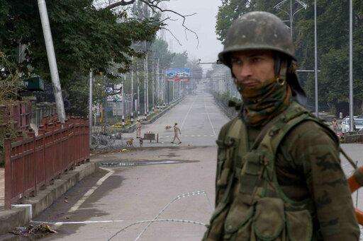 Indian paramilitary soldier stands guard on a deserted road leading towards Independence Day parade venue during lockdown in Srinagar, Indian controlled Kashmir, Thursday, Aug. 15, 2019.Indian Prime Minister Narendra Modi says that stripping the disputed Kashmir region of its statehood and special constitutional provisions has helped unify the country. Modi gave the annual Independence Day address from the historic Red Fort in New Delhi as an unprecedented security lockdown kept people in Indian-administered Kashmir indoors for an eleventh day. (AP Photo/ Dar Yasin)