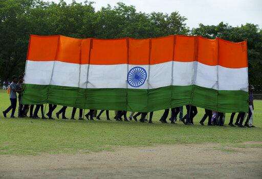 Students hold a huge Indian flag as they perform a dance during the Independence Day celebrations in Hyderabad, India, Thursday, Aug.15, 2019. Indian Prime Minister Narendra Modi defended his government's controversial measure to strip the disputed Kashmir region of its statehood and special constitutional provisions in an Independence Day speech Thursday, as about 4 million Kashmiris stayed indoors for the 11th day of an unprecedented security lockdown and communications blackout. (Mahesh Kumar A.)