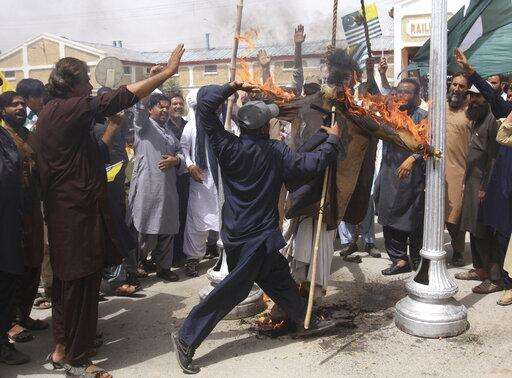 A Pakistani protester beats a burning effigy of Indian Prime Minister Narendra Modi during a protest in Quetta, Pakistan, Thursday, Aug. 15, 2019. Pakistan's prime minister has questioned the silence of world community over recent change in the status of Indian-administered sector of Kashmir by New Delhi and lingering imposition of security clampdown which deprived Kashmiri people of their basic rights. (AP Photo/Arshad Butt)