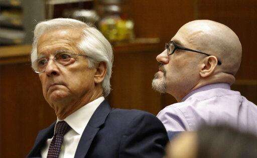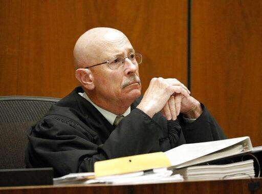 Judge Larry P. Fidler presides as Michael Gargiulo, not shown, listens as his guilty verdicts on all counts are read in Los Angeles Superior Court Thursday, Aug. 15, 2019. Gargiulo was charged with the murder of 22-year-old Ashley Ellerin in her Hollywood home in 2001 - on a night when she was supposed to have drinks with Ashton Kutcher, who testified at the trial. (Al Seib/Los Angeles Times via AP, Pool) The Associated Press