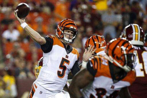 Dalton was 5 of 9 for 36 yards and an interception in three series before giving way to Finley. Redskins defensive lineman Daron Payne tipped Dalton's third-down pass in the red zone, and safety Montae Nicholson picked it off and returned it 96 yards for a touchdown.