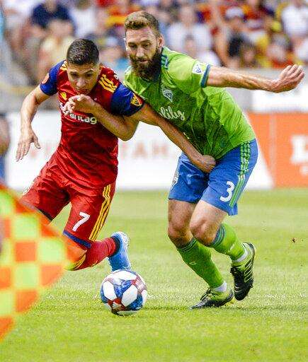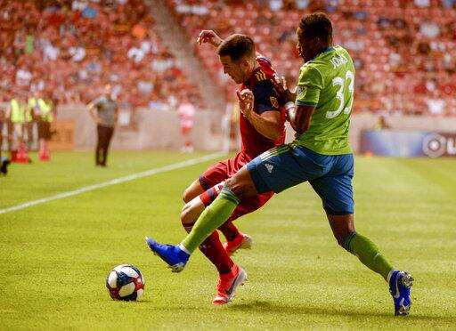 Real Salt Lake defender Aaron Herrera works against Seattle Sounders defender Joevin Jones (33) during the first half of an MLS soccer match Wednesday, Aug. 14, 2019, in Sandy, Utah. (Leah Hogsten/The Salt Lake Tribune via AP) The Associated Press