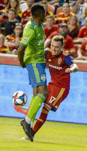 Real Salt Lake forward Corey Baird (17) nails Seattle Sounders defender Kelvin Leerdam (18) in the back with the ball during the first half of an MLS soccer match Wednesday, Aug. 14, 2019, in Sandy, Utah. (Leah Hogsten/The Salt Lake Tribune via AP) The Associated Press