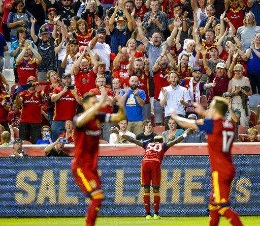 Real Salt Lake forward Sam Johnson (50) celebrates his goal with fans during the first half of the team's MLS soccer match against the Seattle Sounders on Wednesday, Aug. 14, 2019, in Sandy, Utah. (Leah Hogsten/The Salt Lake Tribune via AP) The Associated Press