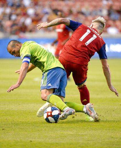 Seattle Sounders midfielder Nicolas Lodeiro (10) hits the pitch while working against Real Salt Lake midfielder Albert Rusnak (11) during the first half of an MLS soccer match Wednesday, Aug. 14, 2019, in Sandy, Utah. (Leah Hogsten/The Salt Lake Tribune via AP) The Associated Press