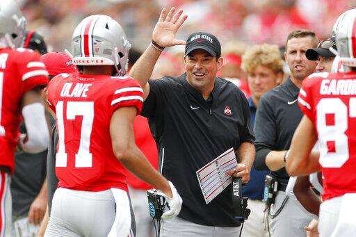Ohio State head coach Ryan Day, center, celebrates their touchdown against Florida Atlantic during the first half of an NCAA college football game Saturday, Aug. 31, 2019, in Columbus, Ohio. (AP Photo/Jay LaPrete) The Associated Press
