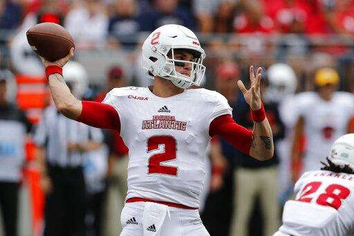 Florida Atlantic quarterback Chris Robison throws a pass against Ohio State during the first half of an NCAA college football game Saturday, Aug. 31, 2019, in Columbus, Ohio. (AP Photo/Jay LaPrete) The Associated Press