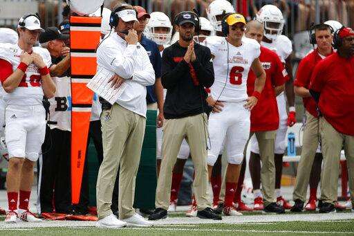 Florida Atlantic head coach Lane Kiffin, left, watches his team during the first half of an NCAA college football game against Ohio State, Saturday, Aug. 31, 2019, in Columbus, Ohio. (AP Photo/Jay LaPrete) The Associated Press