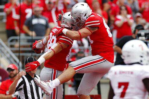 Ohio State tight end Jeremy Ruckert, left, celebrates his touchdown against Florida Atlantic with teammate tight end Luke Farrell during the first half of an NCAA college football game Saturday, Aug. 31, 2019, in Columbus, Ohio. (AP Photo/Jay LaPrete) The Associated Press