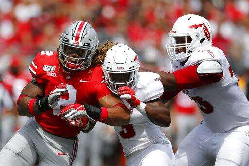 Ohio State defensive end Chase Young, left, fights off blocks from Florida Atlantic running back Larry McCammon, center, and lineman Brandon Walton during the first half of an NCAA college football game Saturday, Aug. 31, 2019, in Columbus, Ohio. (AP Photo/Jay LaPrete) The Associated Press