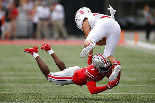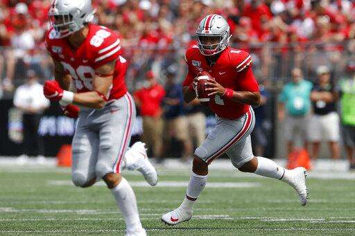 COLUMBUS, Ohio (AP) - Justin Fields threw four touchdown passes and ran for a score in his first game for Ohio State and the fifth-ranked Buckeyes rolled over FAU 45-21 on Saturday in the season opener.