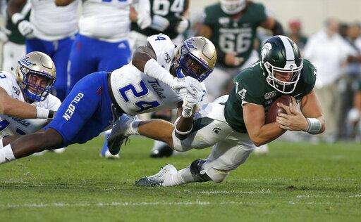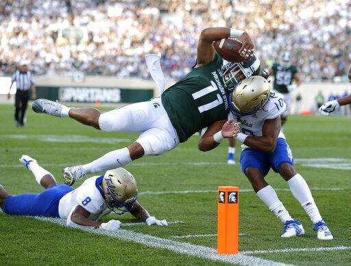 Michigan State got the ball first and capped a penalty-aided drive with a 15-yard touchdown pass from Brian Lewerke to Connor Heyward. Then the defense - which was No. 1 in the nation against the run last season - took over.