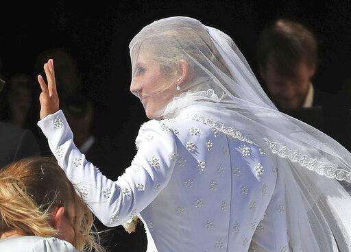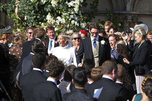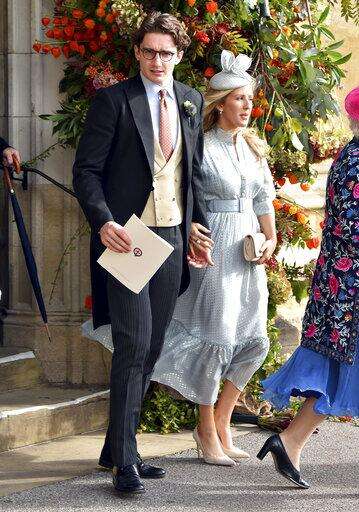 FILE - In this Oct. 12, 2018 file photo, Caspar Joplin, left, and singer Ellie Goulding depart after the wedding of Princess Eugenie of York and Jack Brooksbank at St George's Chapel, Windsor Castle, near London, England. Goulding married Jopling in a lavish ceremony Saturday, Aug. 31, 2019 with pals Katy Perry, Orlando Bloom and Sienna Miller in attendance. The two tied the knot in Yorkshire, England, at the gothic York Minster Cathedral.(Matt Crossick, Pool via AP, File)