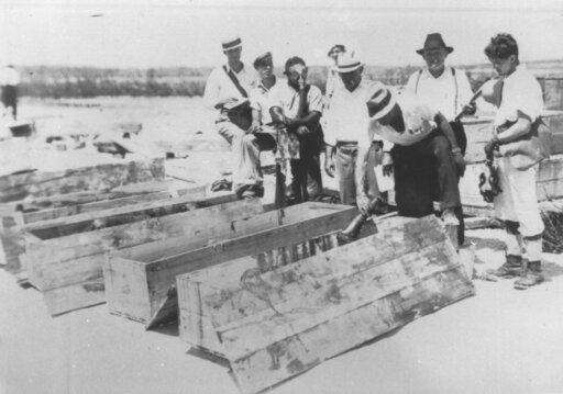 In this undated photo made available by the Keys History & Discovery Center, shows a group of men placing bodies in coffins after the Labor Day hurricane of 1935 in the Florida Keys. Over 400 people, many of them World War I veterans, perished in the storm. They were building bridges to connect the island chain to the mainland when the storm struck. (Keys History & Discovery Center via AP) The Associated Press